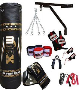 In combinazione con quello che consideriamo il miglior sacco da boxe economico da 120 cm di altezza, il marchio MADX vi offre un set completo di allenamento che vi aiuterà senza dubbio molto con gli esercizi. Guanti imbottiti per evitare lesioni, catene, un paio di bende e corde per saltare sono solo alcuni degli articoli inclusi in questo kit sportivo completo.